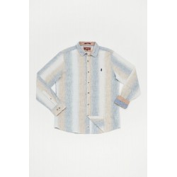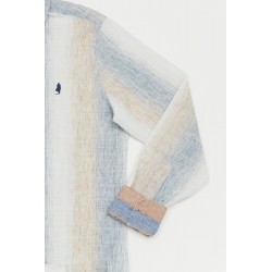 Chemise tissé teint à grosses rayures colorées. Sous col, bande de col et intérieur poignet en tissu contrasté. Col souple. Liseré de couleur au pied de col et au poignet.