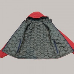 Véritable vêtement plein hiver, elle est structurée d'une fasse lisse imperméable et l'autre matelassée et de bas de manches élastiqués. Un patch en cuir avec rider vient s'apposer sur le biceps du côté gauche.